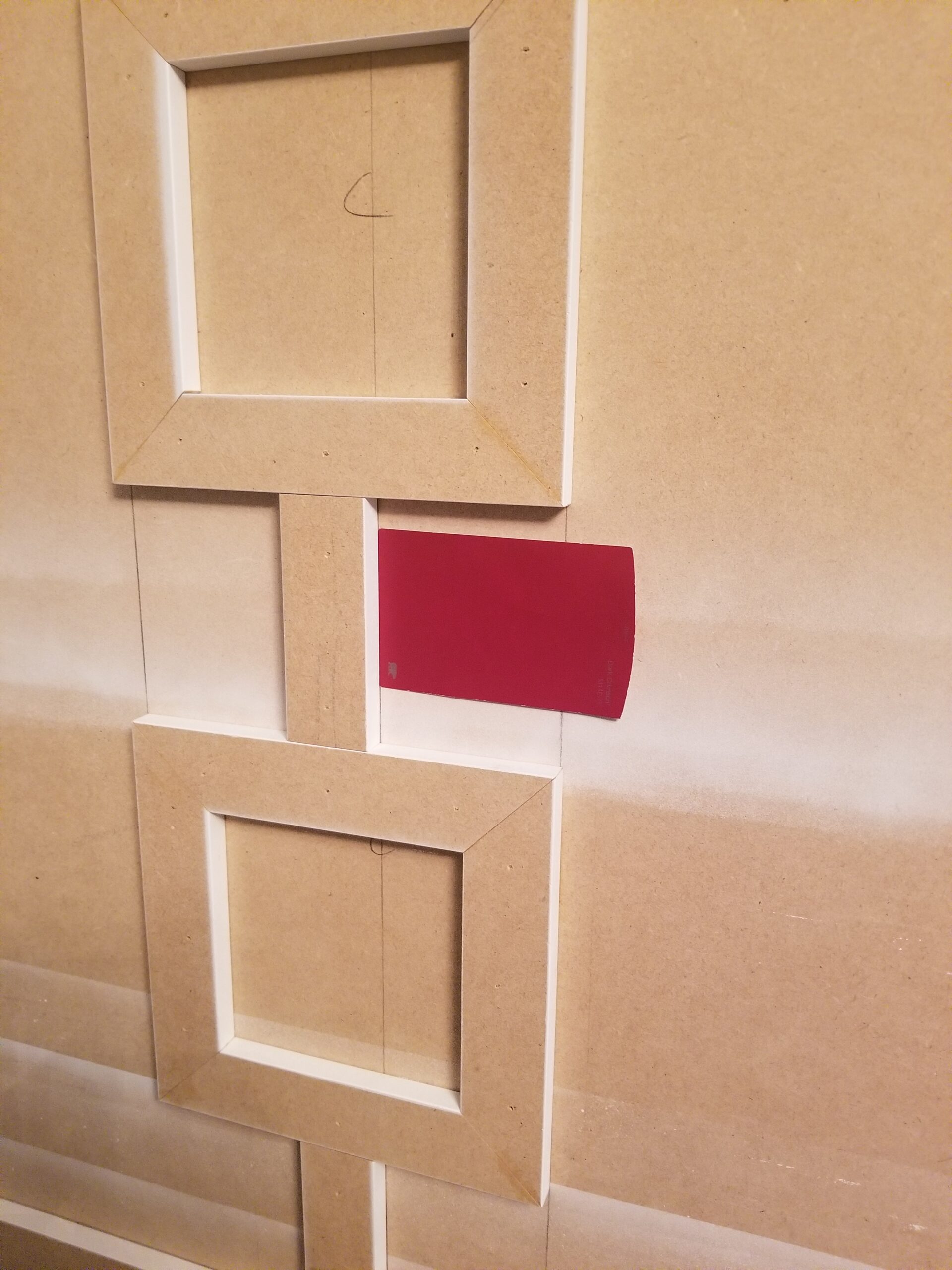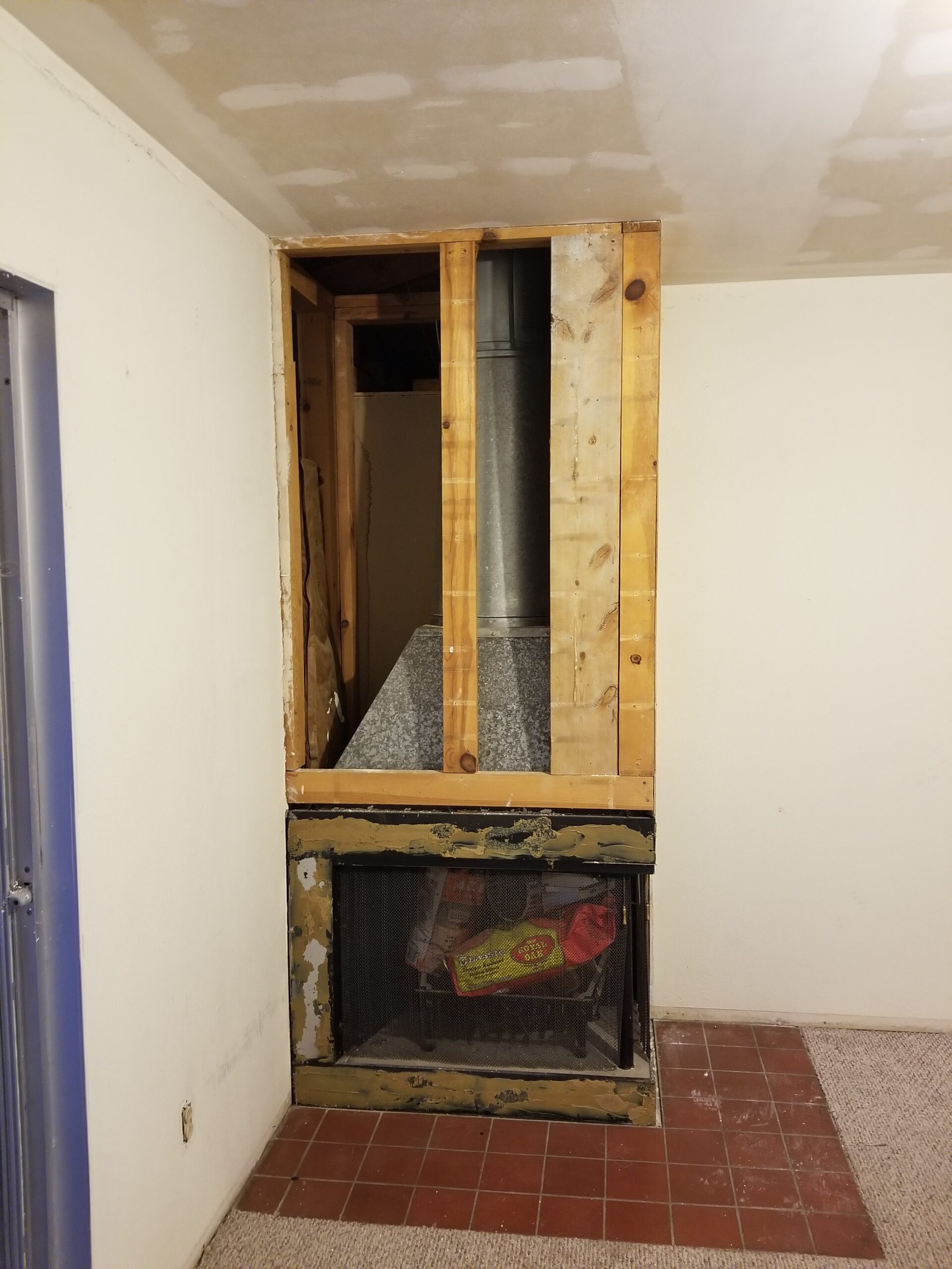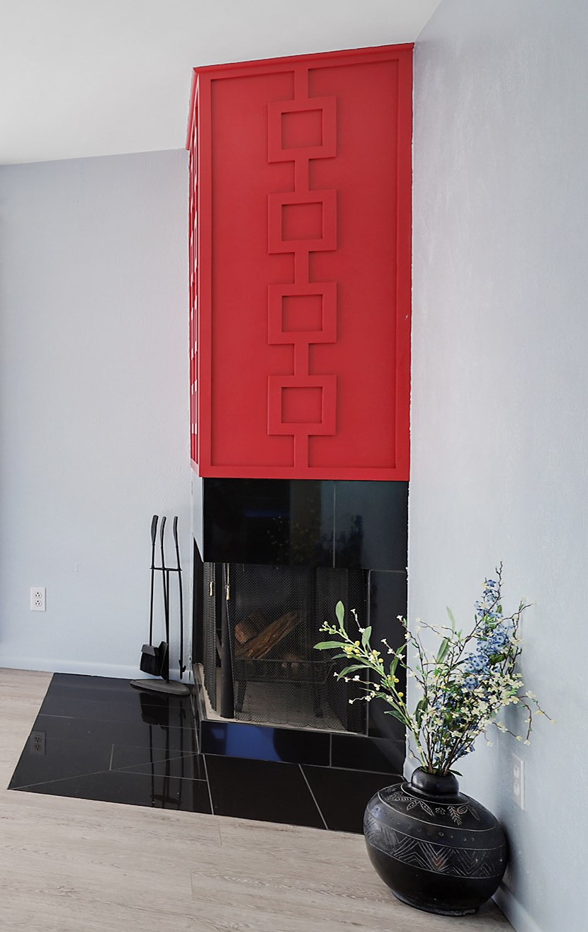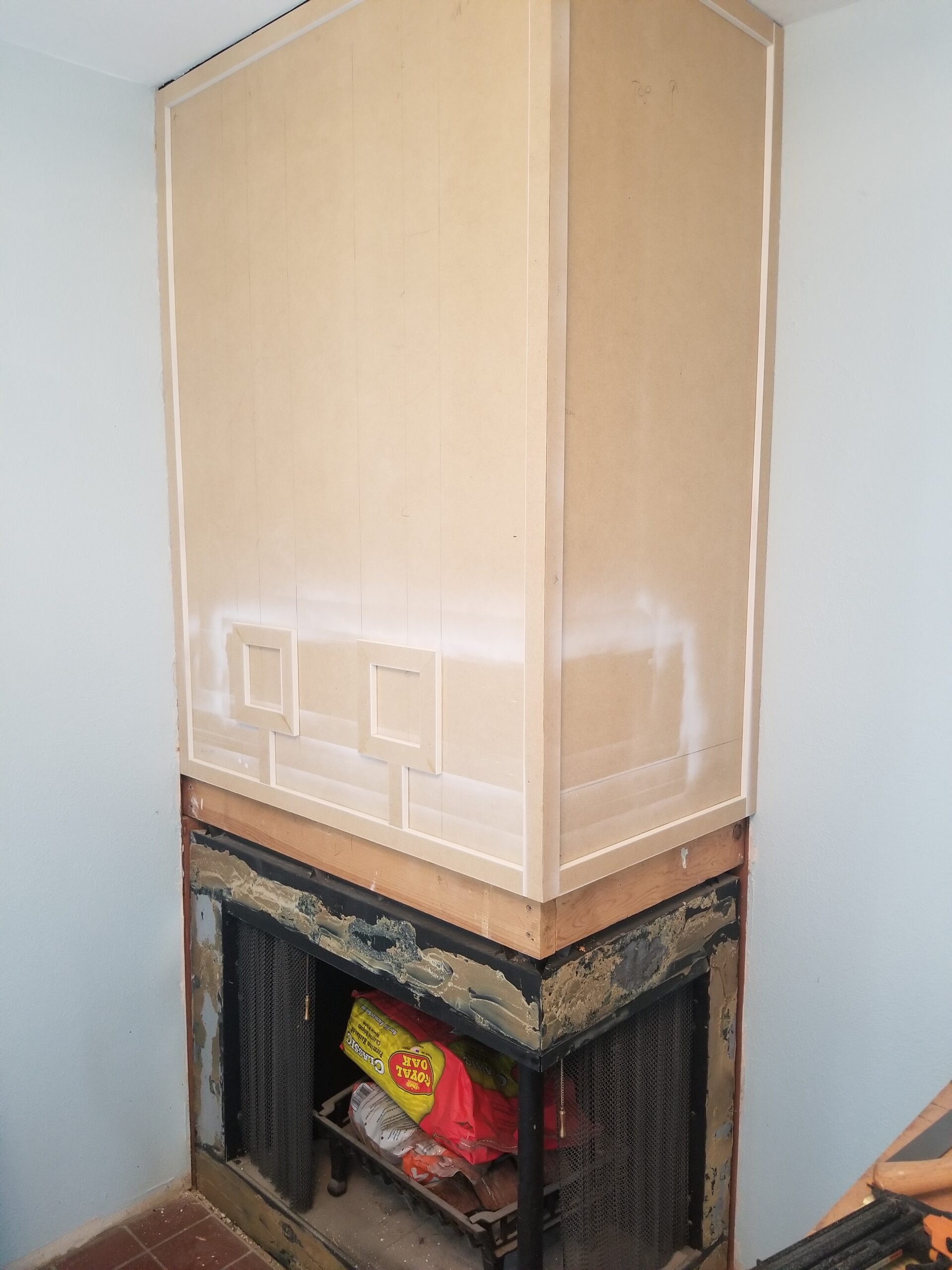 Before & After of bathroom remodel with Fabricut wallpaperBathroom refresh with new paint, fixtures, hardware, & mirrorOutdated fireplace surround beforeClose up of fireplace paneling & color selectionRemodeled fireplace surround with custom panelingRemodeled living area with decorative paneling on fireplace